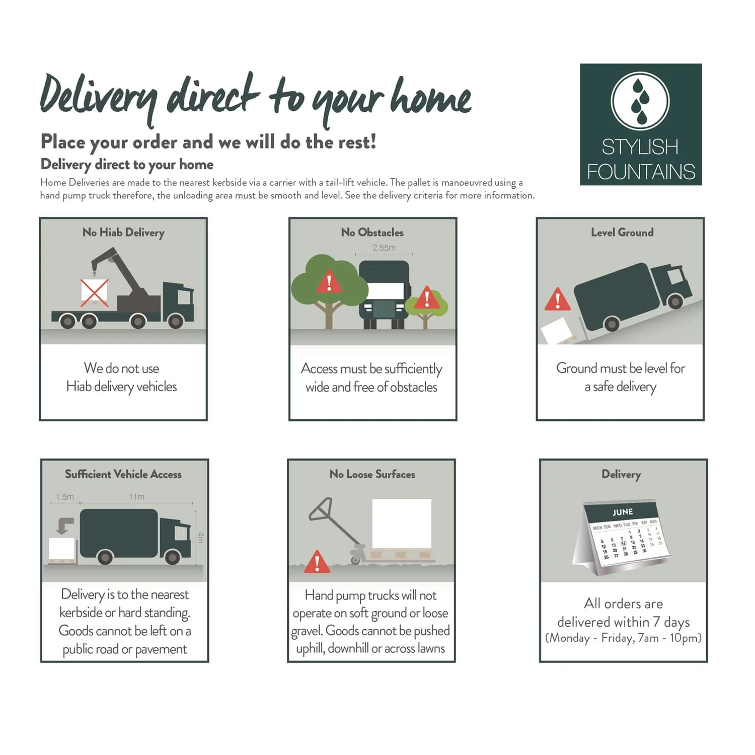 | Additional Information | If this fountain is being installed outside then it is recommended that you use a qualified electrician. This product is hand stained and crafted therefore variations will occur. Please ensure you meet the delivery criteria for this product prior to ordering. Home deliveries are made to the nearest kerbside/hard standing with a tail-lift vehicle. The pallet is manoeuvred using a hand pump truck therefore the unloading area must be smooth and level. |